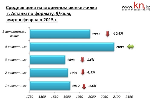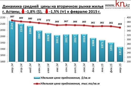 По наблюдениям аналитиков kn.kz, в марте 2015 средние цены в сегменте дорогого жилья сократились на 2,0%, а в сегменте дешевого жилья — на 1,7%. За год снижение в сегменте дешевого жилья составило около 10,2%, в сегменте дорогого жилья — 9%.