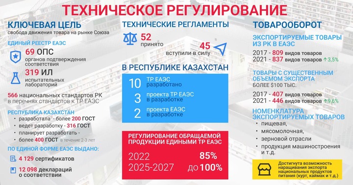 По его словам, при создании в 2010 году Таможенного союза трех стран (Беларусь, Казахстан, Россия) наиболее продвинутая система техрегулирования и нормативная база были именно у Казахстана – более 85 национальных техрегламентов. У России в тот момент было всего около 20 техрегламентов (в том числе и ввиду сложности их принятия через федеральные законы), у Беларуси - 13.