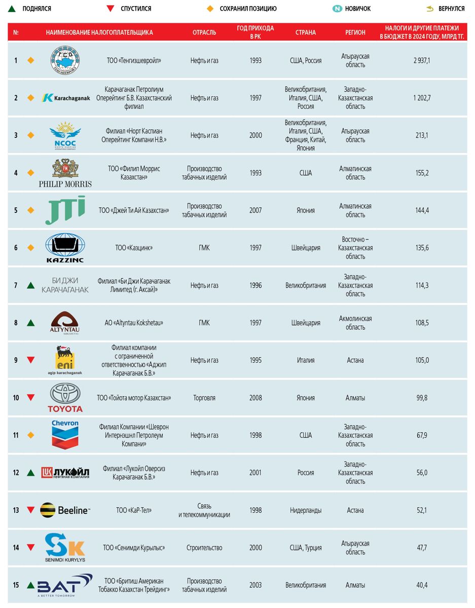 Первое место в ренкинге занял крупнейший налогоплательщик страны — ТОО «Тенгизшевройл» (ТШО), чьи налоговые выплаты составили 2,9 трлн тенге. По сравнению с предыдущим годом, когда компания направила в бюджет 3,56 трлн тенге, наблюдается снижение на 624 млрд тенге, или на 17,5 %. На долю ТШО пришлось 49,2 % от общего объема выплат всех участников ренкинга.