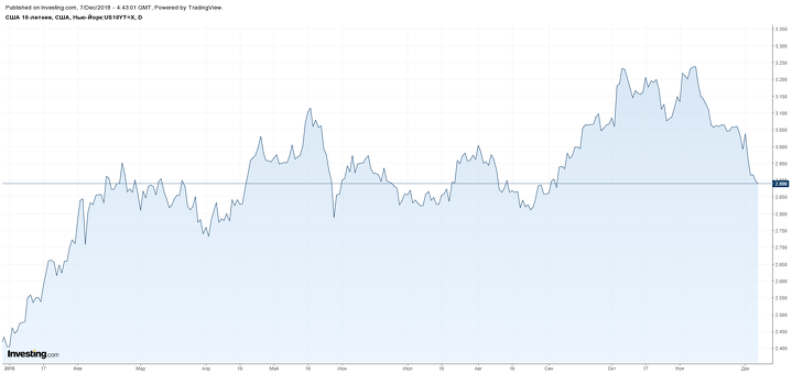 На валютных торгах четверга российский рубль умеренно снижался к доллару США на фоне падения цен на нефть и глобального бегства от рисковых активов. По итогам торгов пара USDRUB вплотную приблизилась к отметке 67 рублей за доллар, показав рост на 0,46%. Давление на рубль помимо санкционных рисков оказывает и возможное решение о возобновлении интервенций Банком России с 15 января 2019. Об этом ранее сигнализировала глава ЦБРФ Эльвира Набиуллина. Решение, возможно, будет принято по итогам заседания совета директоров в следующую пятницу, 14 декабря. При этом распродажа на мировых фондовых рынках также затронула и российский рынок акций – индекс Мосбиржи вчера снизился на 1,36% ,до 2412,31 пункта, индекс РТС - на 1,64% до 1134,07 пункта. В то же время доходность российских 10-летних гособлигаций выросла с 8,69 до 8,75% годовых.