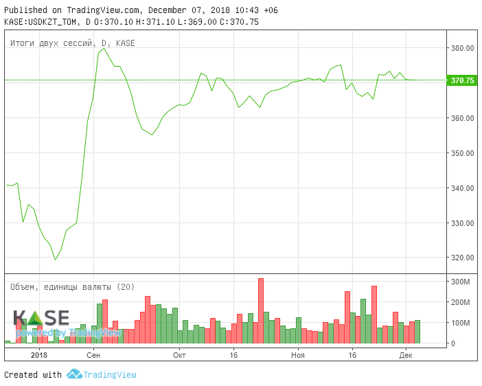 Несмотря на снижение нефтяных котировок, тенге, вслед за российским рублём, продемонстрировал позитивную динамику в отношении к доллару США. Так, средневзвешенный курс по паре USDKZT по итогам торгов на KASE в четверг сложился на уровне 369,98 тенге за доллар (-1,82 тенге). При этом объём торгов был заметно ниже привычного уровня – $111,3 млн, тогда как средние объёмы торгов в 2018 составляли $153,4 млн. В то же время курс российского рубля не изменился – 5,56 тенге за рубль.