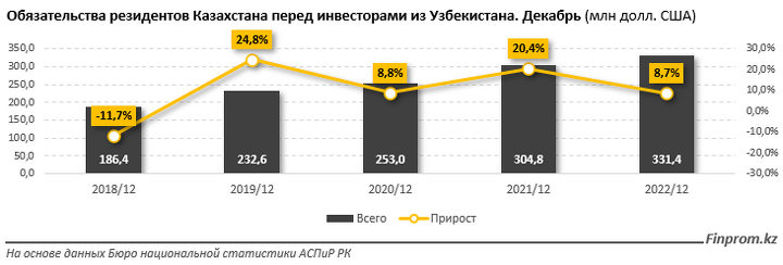 Обязательства резидентов Казахстана перед инвесторами из Узбекистана на 1 января текущего года составили $331,4 млн — на 8,7% больше, чем годом ранее.