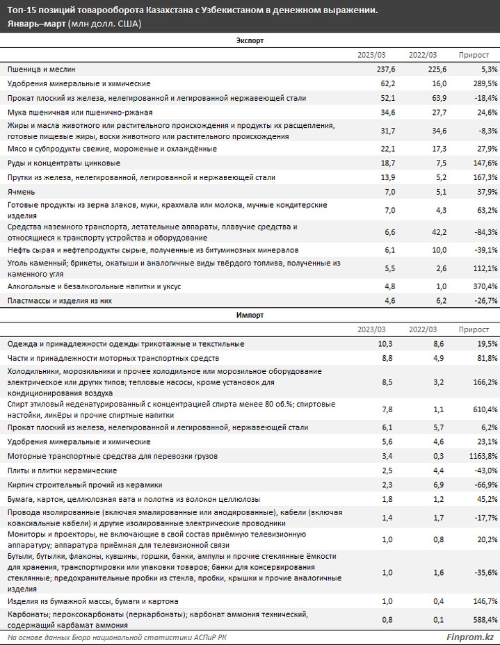 По итогам января–марта текущего года товарооборот Казахстана с Узбекистаном составил $1,1 млрд — на 5,2% больше, чем годом ранее, передает finprom.kz.