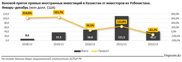 Валовой приток прямых инвестиций из Узбекистана в Казахстан за январь–декабрь 2022 года составил $42,2 млн — сразу на 62,2% меньше, чем годом ранее.