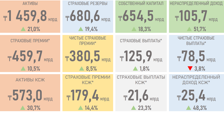 За 10 месяцев 2020 года страховые компании собрали страховых премий на 459,7 млрд тенге, что на 10,5% больше, чем за аналогичный период прошлого года. Доля КСЖ в страховых премиях в 2020 году выросла до 39,0% с 37,7% годом ранее. При разбивке премий по видам страхования отмечается рост по всем направлениям. Так, объем премий по добровольным личным видам страхования вырос на 7,0%; по добровольным личным видам страхования — на 20,9%, а рост объема премий по обязательным видам страхования составил 1,4%.