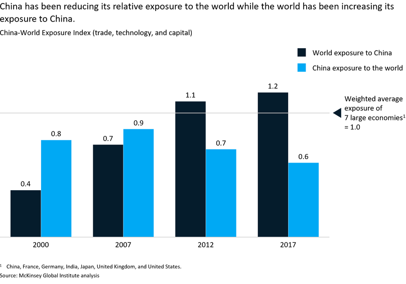 Однако за тот же период влияние Китая на остальной мир возросло, что подчеркивает растущее значение страны как рынка, поставщика товаров и поставщика капитала. Это расхождение, возможно, отражает несбалансированную динамику торговли, которая подпитывает торговую напряжённость с Соединёнными Штатами Америки. Сам масштаб влияния Китая также может быть серьёзным фактором. Более тесные экономические связи с миром стимулировали экономический рост Поднебесной, поскольку страна изучала передовой опыт глобальных игроков и поставляла на рынок конкурентоспособную по стоимости продукцию. Но были и потери, особенно в виде утраченных рабочих мест в обрабатывающей промышленности, как в Китае, так и в странах с развитой экономикой.