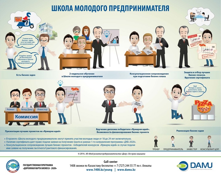 «Школа молодого предпринимателя» существует c 2012 при поддержке Фонда «Даму». Проект позволяет молодым людям от 18 до 29 лет обучиться основам ведения бизнеса, написать бизнес-план под руководством опытных тренеров, защитить его, презентовать проект на «Ярмарке идей». «Ярмарка идей» проводится по итогам обучения каждых двух групп с целью поиска и подбора потенциальных инвесторов и наставников наиболее перспективным бизнес-проектам молодых бизнесменов.