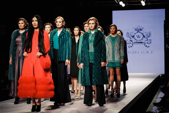 На короткое время подиум преобразился в мир томных звезд экрана, укрытых мехами норки, песца и кашемировыми пальто от Vanity Voice из России.