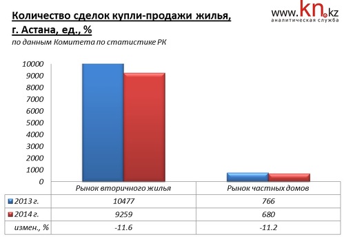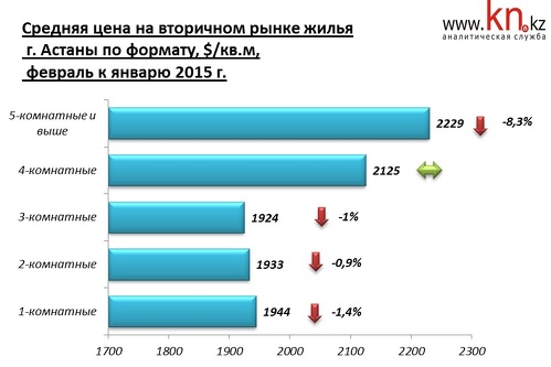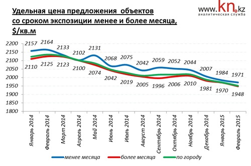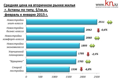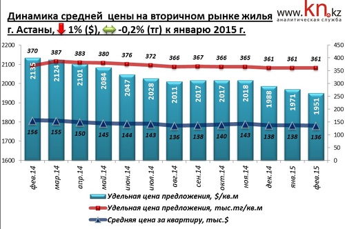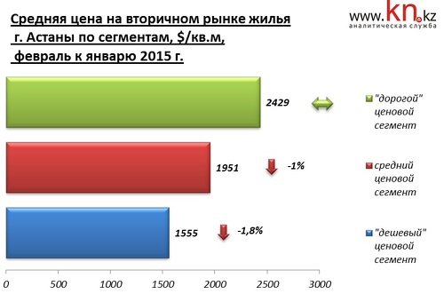 По наблюдениям аналитиков kn.kz, в феврале 2015 средние цены в сегменте дорогого жилья не изменились, а в сегменте дешевого жилья сократились на 1,8%. За год снижение в сегменте дешевого жилья составило 9,4%, в сегменте дорогого жилья — 7,3%.