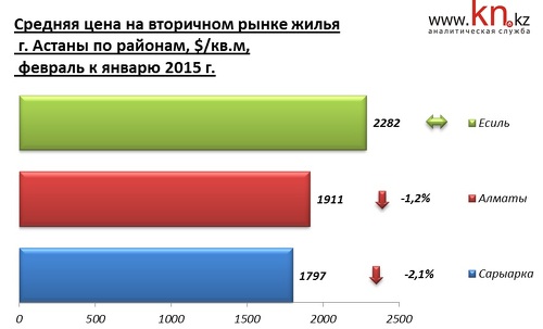 По данным аналитической службы kn.kz, в течение февраля 2015 наибольшее снижение цен наблюдается в новом административном районе Сарыарка — на 2,1%. В районе правого берега Алматы запрашиваемые цены снизились на 1,2%, а в районе Есиль не изменились.