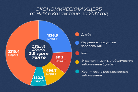 В Казахстане цифры не менее пессимистичны: по данным ВОЗ, 86% всех смертей в нашей стране вызваны неинфекционными заболеваниями. Злоупотребление алкоголем, курение, переедание стоят нашей стране по меньшей мере 2,3 трлн тенге в год. По данным ВОЗ за 2017 год ущерб от неинфекционных заболеваний составил 4,5% от ВВП страны.