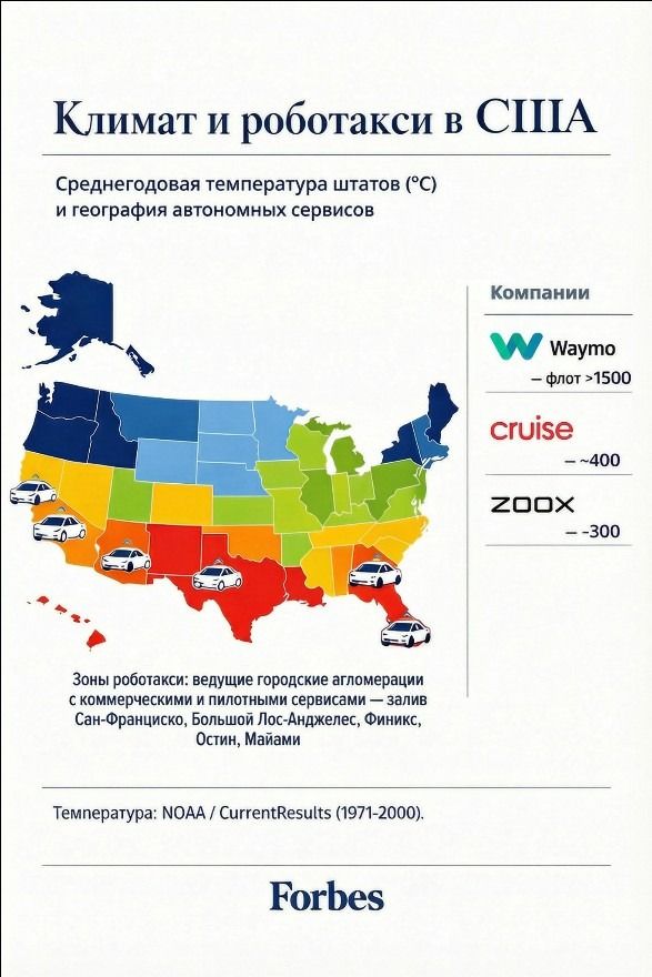 Waymo и Cruise не случайно избегают холодных регионов. Их основные зоны работы — Аризона и южная Калифорния, где главная погодная проблема — это редкий дождь. Даже ограниченные тесты в Мичигане проводятся с водителями-операторами, потому что снег для беспилотника — это фундаментальная слепота.