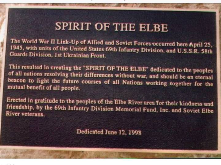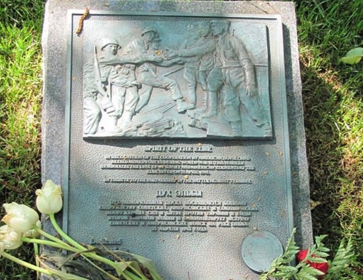 ...В 1995 в столице США, на знаменитом Арлингтонском кладбище, в честь 50-летия победы над фашизмом был установлен памятник, посвященный встрече двух союзных армий на берегах немецкой реки в апреле 1945. Памятник получил название "Дух Эльбы". Похожий памятник спустя три года установили уже в Германии на точке встречи. Там на гранитной плите написаны слова: