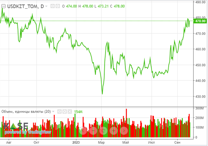 На сегодняшней сессии, в понедельник, 2 октября, пара USDKZT (10:25 ALA) торгуется на уровне 479,4 тенге за доллар.