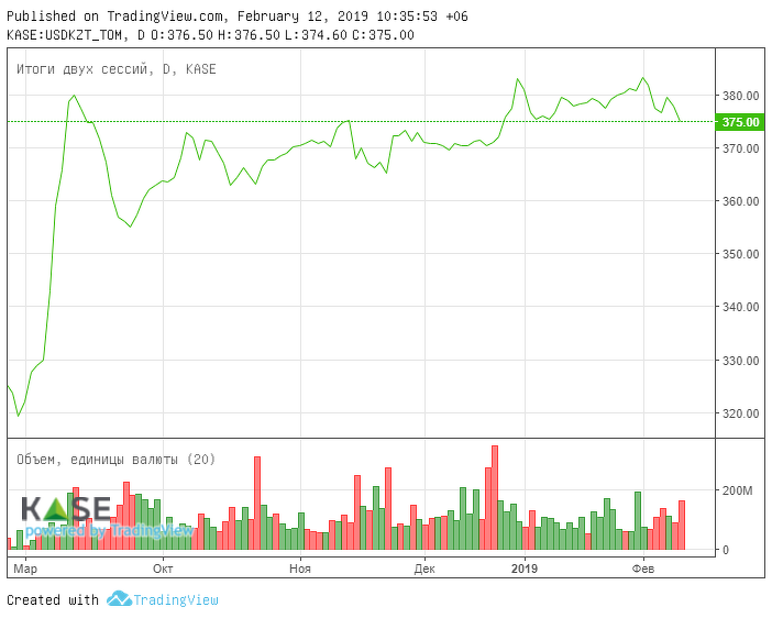 На текущий момент (10:20 AST) курс по паре USDKZT составляет 375,30 тенге за доллар, что на 23 тиына ниже уровня средневзвешенного значения предыдущего дня.