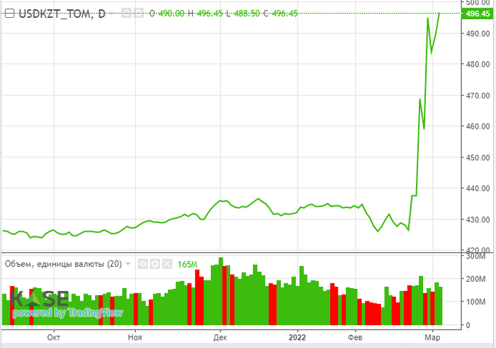 На фоне рекордно высоких цен на сырье нацвалюта в четверг продолжила сдержанно реагировать на ухудшение геополитической ситуации в регионе. По итогам торгов четверга на KASE курс по паре USDKZT вырос до отметки 493,43 тенге за доллар (+3,12 тенге). При этом торговая активность была умеренно повышенной. Объем торгов составил 165,0 млн долларов (-19,0 млн), тогда как среднесуточный объем в текущем году составляет 151,9 млн долларов. Напомним, на стороне нацвалюты выступает ряд оперативных мер НБРК и правительства, а также продажа валюты из Нацфонда и КГС.