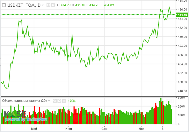Так, на утренней сессии пара USDKZT (10:20 ALA) торгуется на уровне 433,95 тенге за доллар, что на 0,94 тенге ниже средневзвешенного курса закрытия предыдущей сессии.