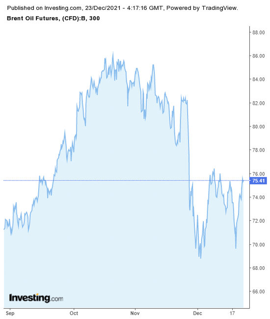На новостях о снижении запасов нефти в США котировки нефти Brent закрылись в среду со значимым приростом на 2,1%, достигнув отметки 75,6 доллара за баррель. Согласно данным Управления энергетической информации (EIA) Минэнерго США, на прошлой неделе запасы нефти в стране сократились сразу на 4,7 млн баррелей. При этом нефтетрейдеры ожидали более скромного снижения запасов – на 2,5 млн баррелей. Поддержку рынку также оказывала вышеупомянутая сильная статистика по экономике США и новости о падении заболеваемостью «Омикроном» в ЮАР. Сообщается, что у этой волны Covid-19 не было последствий в виде резкого увеличения количества госпитализаций и смертей. Сегодня в фокусе внимания данные Baker Hughes об изменении количества действующих нефтяных буровых установок в США, которые выходят на день раньше из-за празднования Рождества.