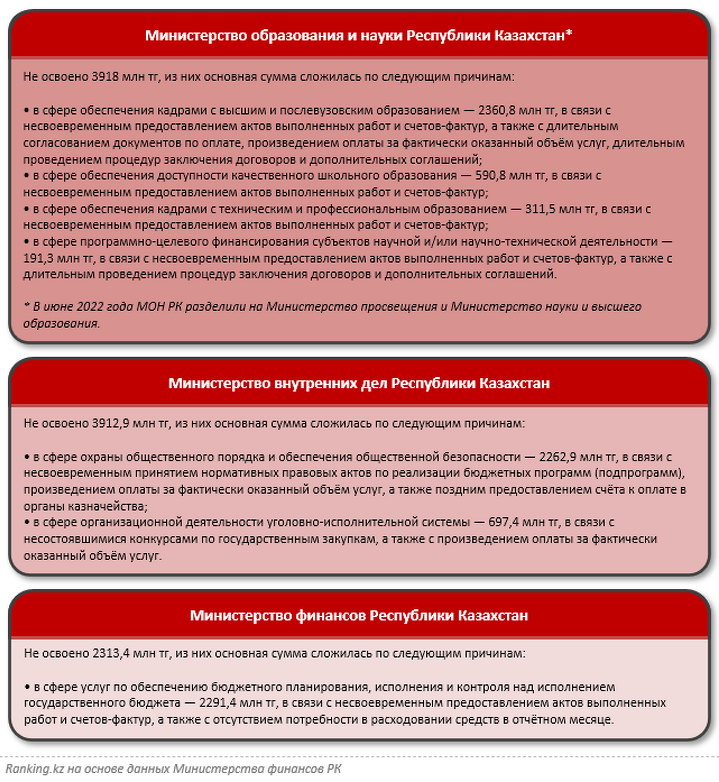 Как передает ranking.kz, oсновные причины неосвоения — длительное проведение процедур заключения договоров, несвоевременное предоставление актов выполненных работ и счетов-фактур, позднее представление счетов к оплате, произведение оплаты за фактически оказанный объем услуг, отсутствие потребности в расходовании средств в отчетном месяце.