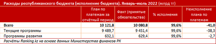 Расходы республиканского бюджета на реализацию бюджетных программ на 2022 год запланированы в сумме 18,8 трлн тенге. За январь – июль текущего года расходы государственного бюджета сложились на уровне 10,1 трлн тенге (принятые обязательства). По сравнению с аналогичным периодом прошлого года общая сумма расходов выросла на 17,5%.
