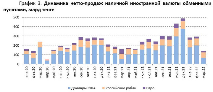 В марте 2022 года биржевой курс тенге изменялся в диапазоне 459,15 – 512,17 тенге за доллар США. На конец марта 2022 года биржевой курс тенге к доллару США составил 467,03 тенге за доллар США, укрепившись за месяц на 5,7%.