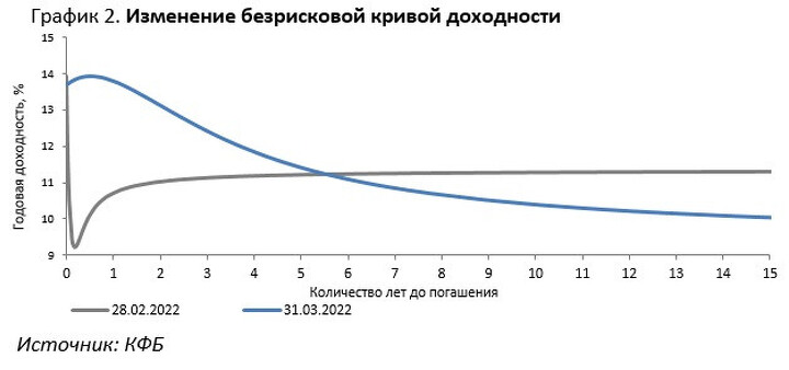 В конце марта 2022 года безрисковая кривая доходности демонстировала инверсионную форму, характеризуя высокую доходность на кратко- и среднесрочном отрезке до 5 лет относительно конца предыдущего месяца.