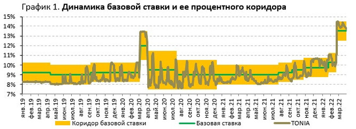 9 марта 2022 года Национальный банк сохранил базовую ставку на уровне 13,5% годовых с процентным коридором +/– 1,00 п.п., 25 апреля повысил на 0,5п.п., до 14% годовых с процентным коридором +/– 1,00 п.п. с учетом роста инфляционного давления.