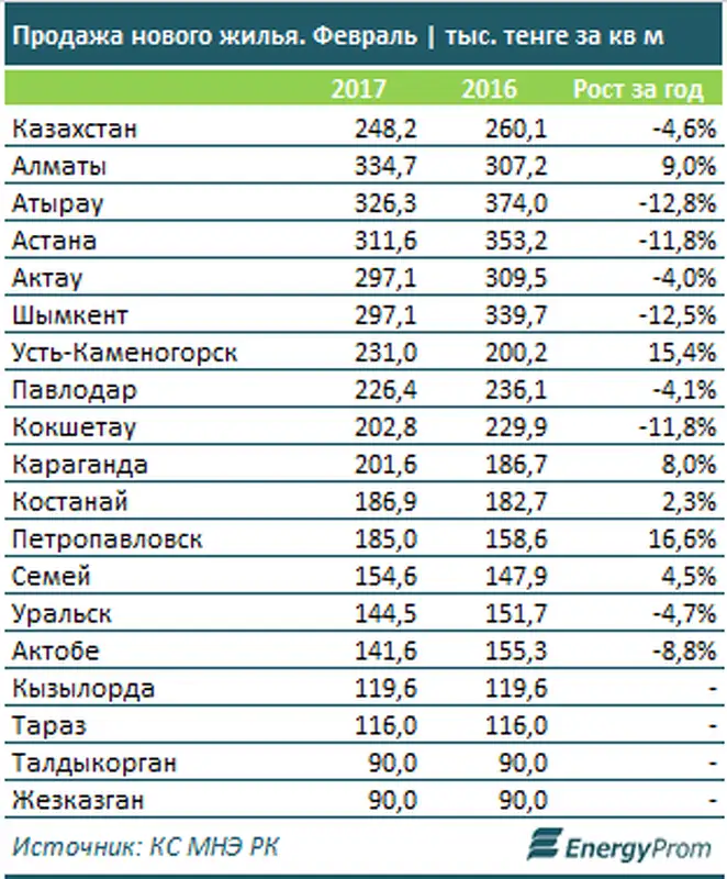 Самые высокие цены на новое жилье наблюдались в обеих столицах и областных центрах нефтяных регионов, а также южном мегаполисе: Алматы - 334,7 тыс. тг за кв м по итогам февраля 2017, плюс 9% за год; Атырау - 326,3 тыс. тг за кв м, минус 12,8% за год; Астана - 311,6 тыс. тг за кв м, минус 11,8% за год; Актау и Шымкент - 297,1 тыс. тг за кв м.