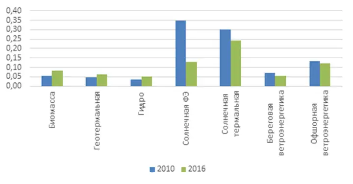 Инвестиции в НИОКР (деятельность, связанную с ведением научно-исследовательских и конструкторских работ) и применение новых технологий повысили эффективность и производительность возобновляемых источников энергии, при этом снизив стоимость производства. Средняя стоимость производства энергии с помощью солнечных фотоэлектрических панелей уменьшилась более чем на 60% в период между 2010 и 2016 годами, в то время как затраты на солнечную тепловую энергию, и морскую и береговую ветроэнергетику снизились на 10-20%. Стоимость других видов возобновляемой энергии: биомассы, геотермальной и гидроэнергетики незначительно повысились. Тем не менее, по стоимости все возобновляемые источники энергии остаются конкурентоспособными по сравнению с традиционными способами производства электроэнергии. Технологическая зрелость и более низкие затраты делают ветряную и солнечную энергетику все более привлекательными для директивных органов, стремящихся повысить энергетическую безопасность за счет диверсификации, снижения загрязнения и сокращения выбросов CO2.