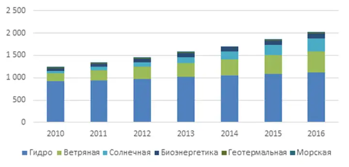 Мировые производственные мощности возобновляемых источников энергии, ГВ (2010-2016 годы)
