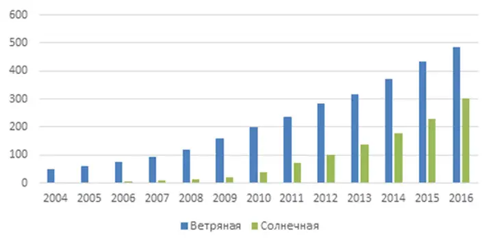 Мировые производственные мощности ветряной и солнечной энергетики, ГВт (2004-2016 годы)