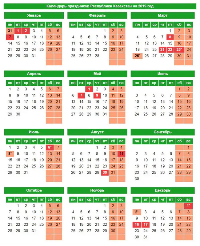 Календарь праздничных дней 2019 года опубликовали на сайте электронного правительства. В этом году нас ждут 119 выходных дня, передает Zakon.kz.