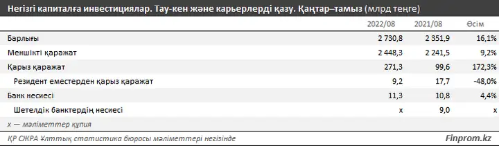 Тау-кен өнеркәсібі мен карьерлерді қазу саласындағы негізгі капиталға салынған барлық инвестициялардың 90%-ға жуығы бизнестің меншікті қаражаты есебінен қамтамасыз етілді: 2,4 трлн теңге, 2021 жылдың қаңтар–тамызымен салыстырғанда ақшалай түрде 9,2% көп.