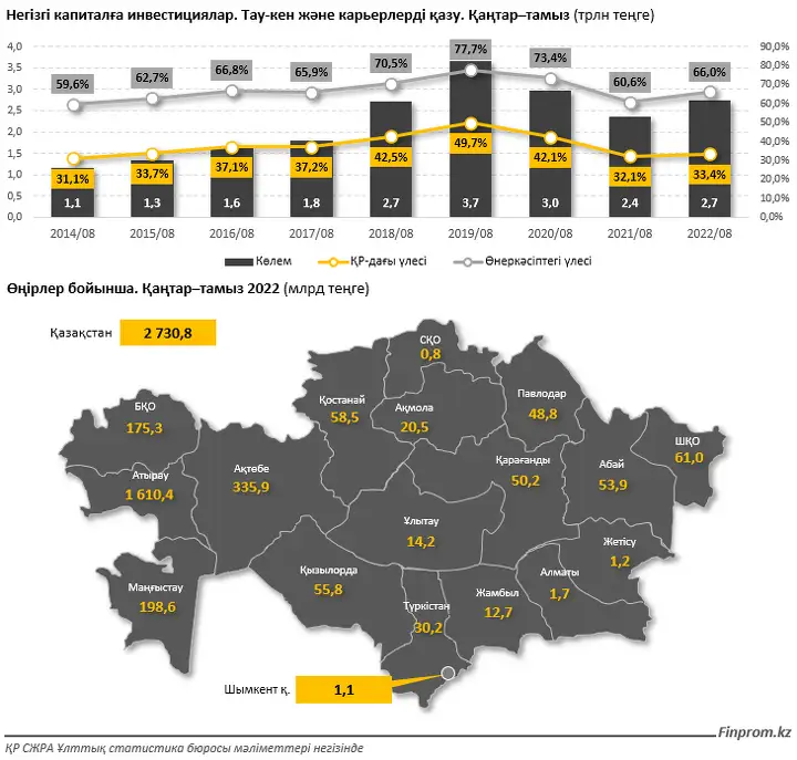 2022 жылғы қаңтар–тамызда тау-кен өнеркәсібі мен карьерлерді қазуға инвестициялардың үлесі өнеркәсіпке салынған инвестициялардың жалпы көлемінің үштен екі бөлігін және ҚР экономикасына салынған жалпы инвестицияның үштен бір бөлігін құрады. Бұл ретте өнеркәсіп саласына күрделі салымдар бір жылда ақшалай түрде 6,6% (ФКИ — 101,1%), ал жалпы ҚР бойынша 11,6% (ФКИ — 105,7%) өскенін көрсетті.