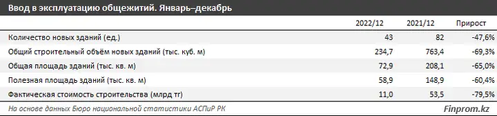 За январь–декабрь 2022 года в эксплуатацию ввели 43 общежития, против 82 в аналогичном периоде годом ранее, передает finprom.kz.