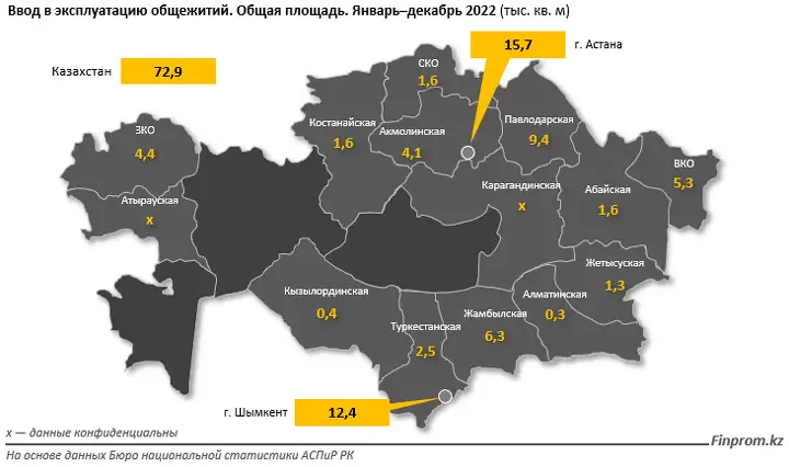 В региональном разрезе наибольшая общая площадь построенных общежитий была зафиксирована в столице: 15,7 тыс. кв. метров. На второй и третьей строчках расположились Шымкент (12,4 тыс. кв. м) и Павлодарская область (9,4 тыс. кв. м).