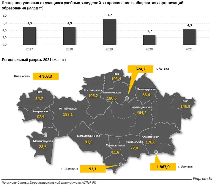 В 2021 году плата, поступившая от учащихся учебных заведений за проживание в общежитиях организаций образования, составляла 4,3 млрд тг — на 58,1% больше, чем годом ранее.