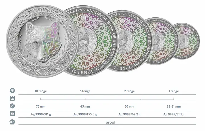 Номиналы 1, 2, 5, және 10 теңгелік, proof сапалы күмістен соғылған KÓKBÓRI инвестициялық монеталары.