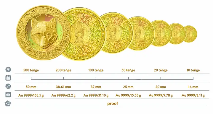 Номиналы 10, 20, 50, 100, 200 және 500 теңгелік, proof сапалы алтыннан соғылған KÓKBÓRI инвестициялық монеталары.