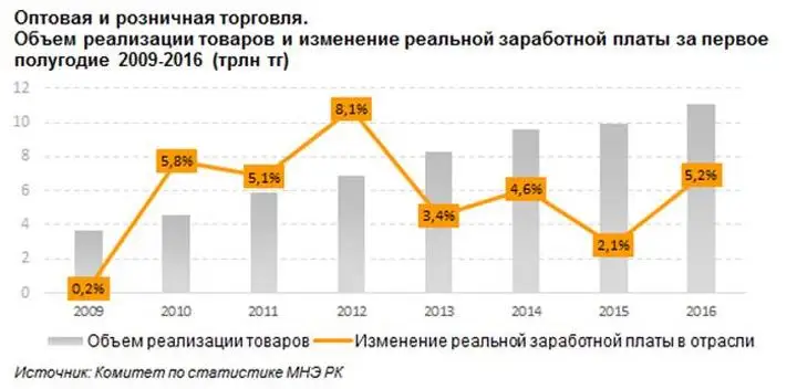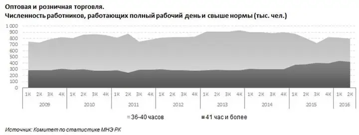 Увеличение рабочей нагрузки следует за ростом оборотов в торговле. В текущем году размер товарооборота во внутренней торговле Казахстана значительно вырос - за январь-июнь 2016 года объем реализации товаров вырос на 12% по сравнению с уровнем про, в том числе в розничной торговле на 21%, в оптовой на 8%.
