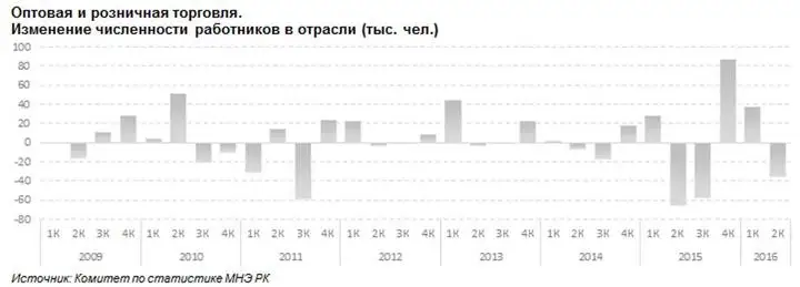 Во втором квартале текущего года численность сотрудников в торговой отрасли дала сезонную усадку, однако уровень сокращения персонала остается довольно высоким. За апрель-июнь 2016 года совокупный размер штатов на предприятиях оптовой и розничной торговли сократился на 36,4 тыс. человек, до 1 млн 262 тыс. человек, сообщает finprom.kz.