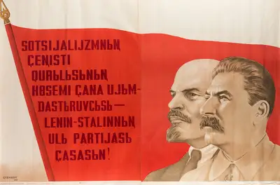Советский плакат на казахском языке с изображениями Владимира Ленина и Иосифа Сталина продают на онлайн-аукционах «Invaluable» и «Barnebys», передает Казинформ.