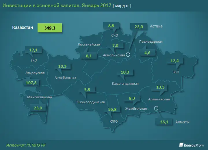 В январе 2017 портфель инвестиций в основной капитал составил 349,3 млрд тг - на 32,9% больше, чем аналогичном периоде годом ранее. Для сравнения, январь 2016 обгонял показатели 2015 всего на 5,6%