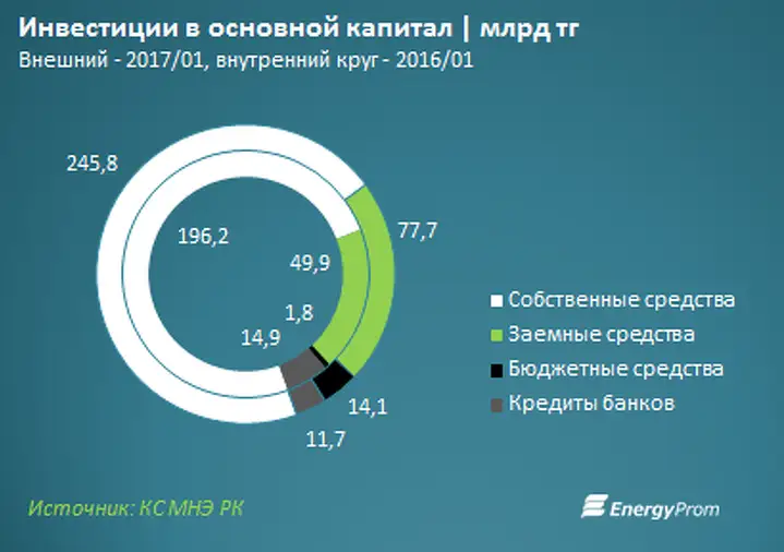 Основные инвестобъемы обеспечил сам бизнес - собственные средства составили 70,4% портфеля: 245,8 млрд тг за январь, +25,3% за год.