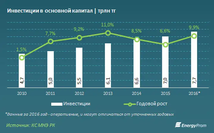 В многолетней динамике годовые темпы роста портфеля инвестиций в основной капитал с 2014 года держатся в коридоре 7-10%. Так, в 2016 объем вложений составил 7,72 триллиона тенге, +9,9% к показателям 2015 года.