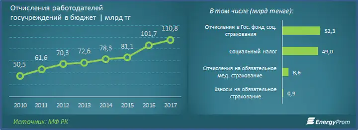 Увеличение бюджетных средств на оплату труда госслужащих оказало влияние на соответствующий рост налоговых и прочих отчислений работодателей на 25%, составив 101,8 млрд тенге. В том числе отчисления в государственный Фонд социального страхования составили 52,3 млрд тенге, социальный налог - 49 млрд тенге.