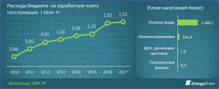 За 2016 год расходы госбюджета на заработную плату работников госсектора увеличились на 18%, составив 1,30 трлн тенге. В текущем году рост составит только 1%, объем выделенных средств увеличится до 1,32 трлн тенге. В том числе на оплату труда будет приходиться 1,2 трлн тенге, 112 млрд тенге компенсационных выплат, 7 млрд тенге на дополнительные денежные выплаты и еще 242 млн тенге на обязательный пенсионный взнос, передает Energyprom.kz.