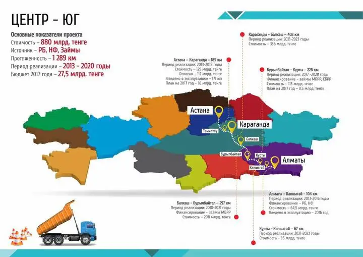 «Со следующего года будет начата реконструкция участка Балхаш - Бурылбайтал, протяженностью 297 км. Работа по реконструкции остальных участков коридора Центр-Юг Караганды - Балхаш протяженностью 403 км, и Курты - Капшагай протяженностью 67 км будет начата в 2020 году», - заключил советник министра.