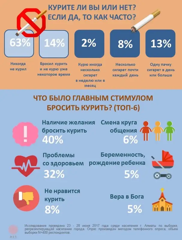 Компания АСТ Казахстан представляет результаты исследования о том, сколько алматинцев курят, хотят ли они бросить курить, и что является стимулом для отказа от курения.