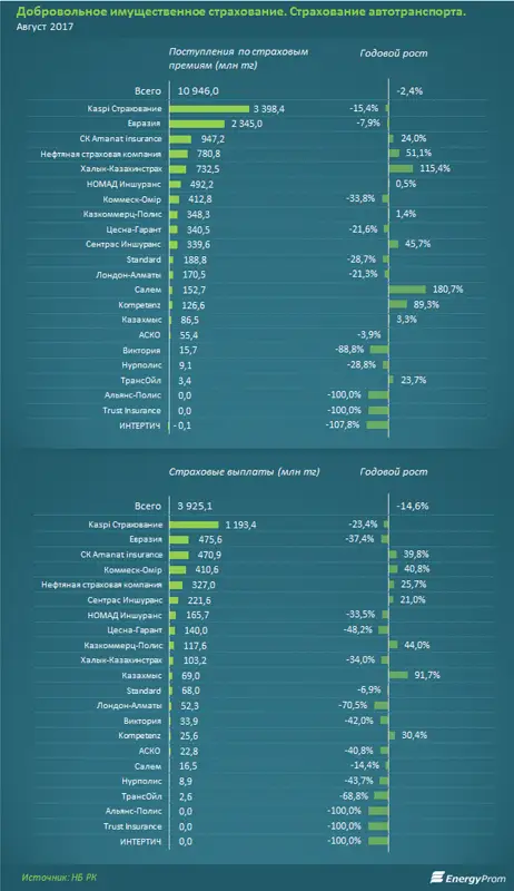 Примечательно, что, переживая об ущербе, который может быть нанесен чужим транспортным средствам пострадавших, им самим или другому их имуществу, автовладельцы РК в то же время проявили меньше заботы о собственных автомобилях. Так, в сегменте добровольного страхования автотранспорта объем страховых премий, собранных компаниями, снизился год-к-году на 2,4%, до 10,9 млрд тг. Среди лидеров по поступлениям страховых премий - "Kaspi Страхование", "Евразия" и "Amanat insurance".